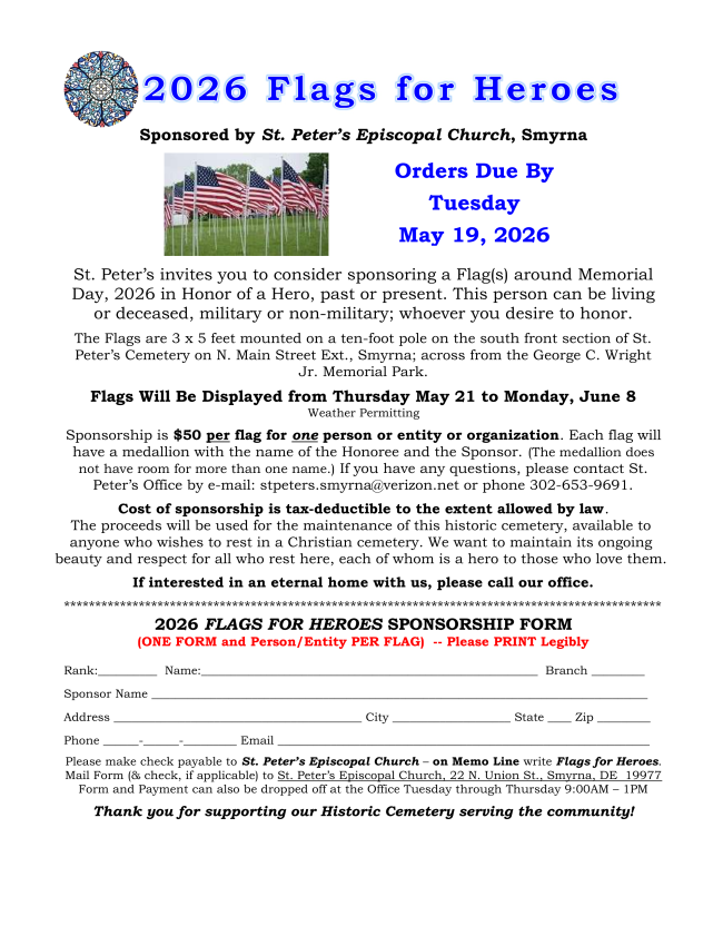 The April Outreach is the “First State Animal Shelter”, Below is a list of items needed by the shelter or monetary donations can be made (checks need to be made out to St. Peter’s Church with “First State Animal Shelter” in the memo line). All donations can be brought in on Sundays or brought to the church during office hours (Tues-Thurs 9AM to 1PM). Wish List Can Cat Food Pate, Clumping Cat litter, Cat Toys, Can Dog Food, Hard Chew Toys, Dog Treats, Clorox Wipes, Dish Soap, Bleach, Paper Towels Toilet Paper, Any size Trash Bags, Liquid Laundry Detergent, Dryer Sheets, Dish Sponges, Towels, wash clothes & Blankets |
